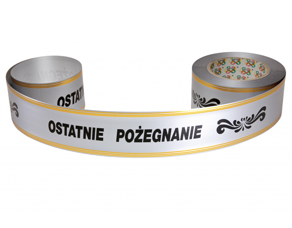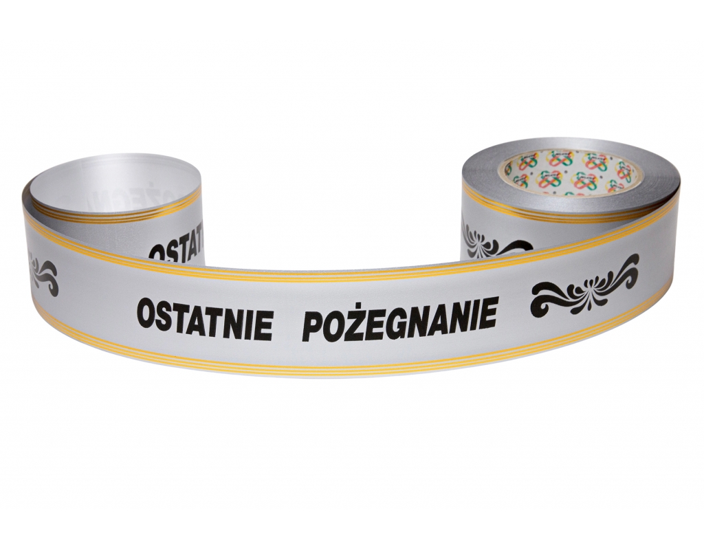 WSTĄŻKA POLIPROPYLENOWA PP POGRZEBOWA Z DRUKOWANYM NAPISEM "OSTATNIE POŻEGNANIE" Z METALIZOWANYMI PASKAMI jest mocna i wytrzymała, a przy tym plastyczna, wodoodporna (nie farbuje).