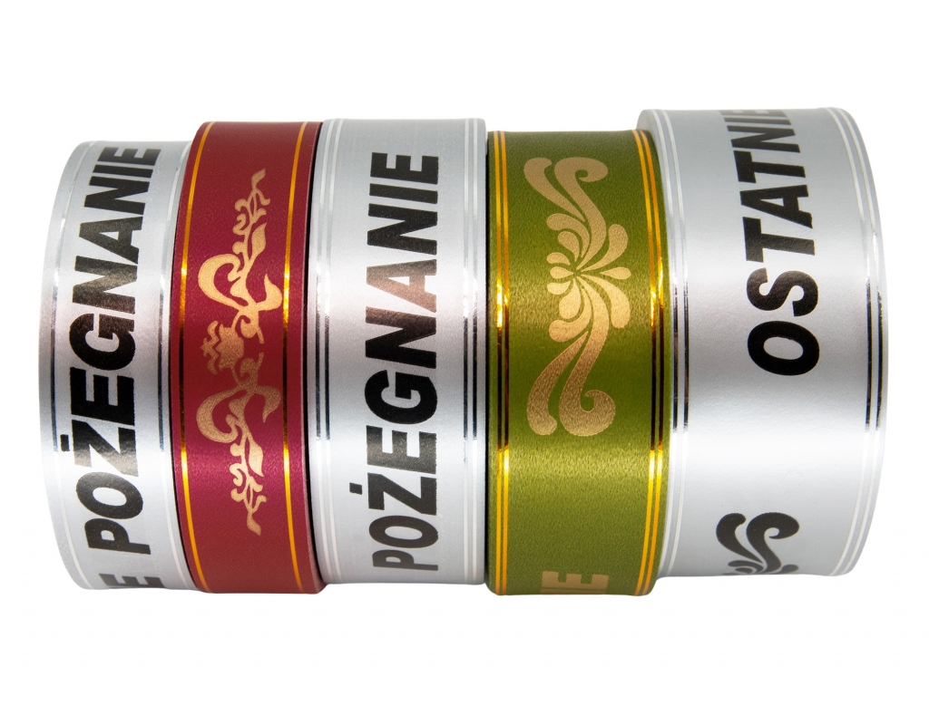 WSTĄŻKA POLIPROPYLENOWA PP POGRZEBOWA Z DRUKOWANYM NAPISEM "OSTATNIE POŻEGNANIE" Z METALIZOWANYMI PASKAMI