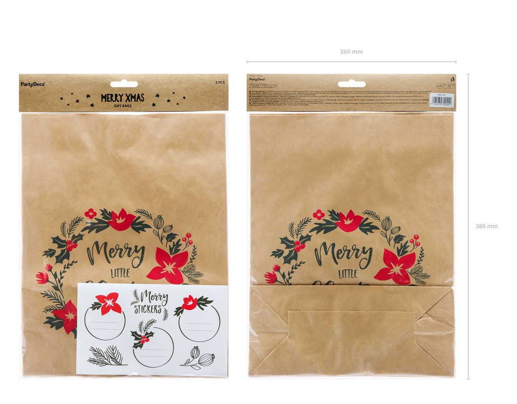 Stylowe TOREBKI PAPIEROWE NA PREZENTY "MERRY LITTLE CHRISTMAS" to doskonały sposób na eleganckie i ekologiczne zapakowanie świątecznych upominków. Wykonane z naturalnego, kraftowego papieru z kolorowym nadrukiem, zachwycają prostym, ponadczasowym designem, który idealnie wpisuje się w bożonarodzeniowy klimat.