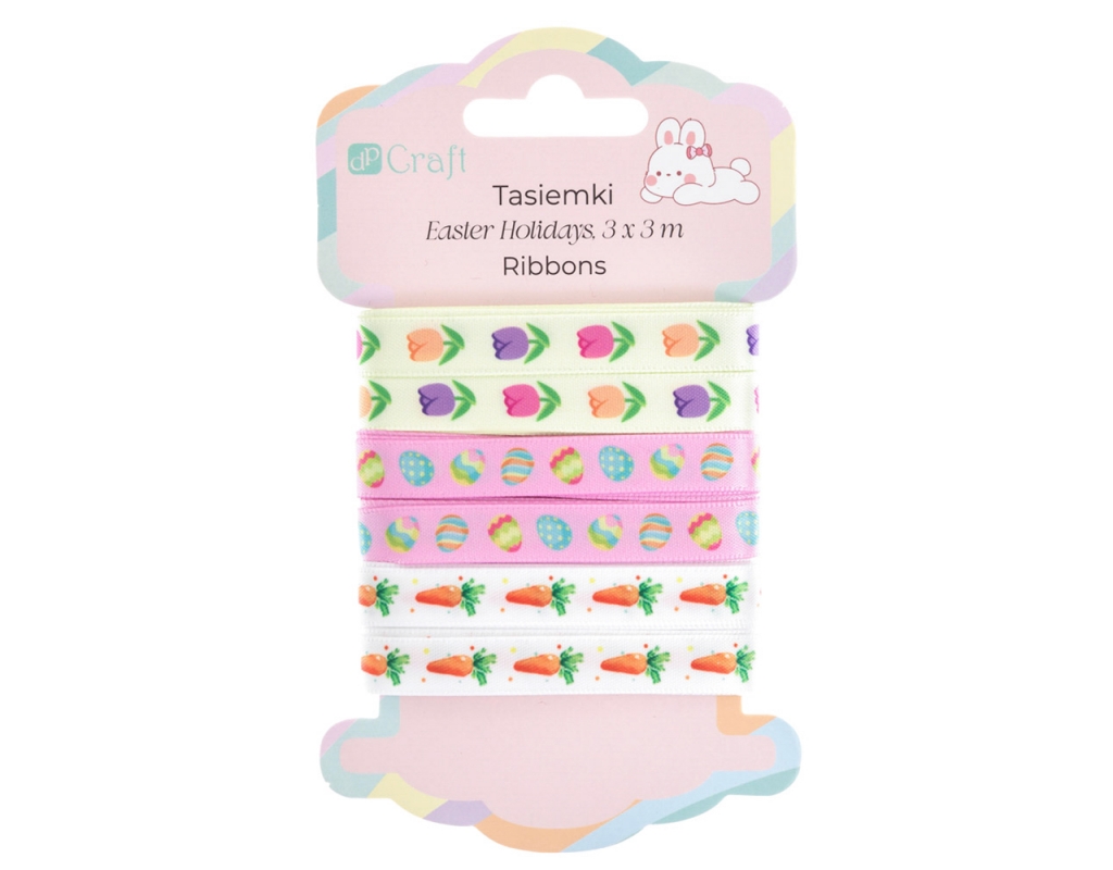 ZESTAW TASIEMEK "EASTER HOLIDAYS" to uroczy komplet wstążeczek z wielkanocnymi i wiosennymi motywami. Kolorowe wzory pisanek, tulipanów i marchewek w pastelowej kolorystyce idealnie wpisują się w wiosenny, radosny klimat i dodają projektom lekkości oraz świeżości. Wstążki doskonale sprawdzą się w scrapbookingu, cardmakingu, dekoracjach wielkanocnych oraz projektach DIY. Są idealne do ozdabiania kartek okolicznościowych, albumów, zaproszeń, koszyczków wielkanocnych, stroików, pakowania prezentów oraz do wielu prac kreatywnych dla dzieci.