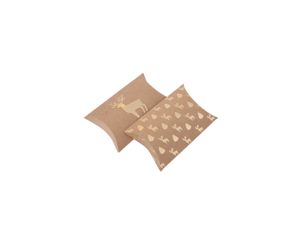 PUDEŁKA SKŁADANE PILLOW BOX "JELEŃ" ze złotym patternem w jelonki i choinki sprawdzą się świetnie jako opakowania na prezenty świąteczne. Można schować do nich m.in. vouchery podarunkowe, biżuterię i inne, drobne upominki. Te tekturowe pudełka nadają się do dodatkowego zdobienia np. wstążeczkami, cekinami, elementami florystycznymi lub naklejkami Pudełeczka są do samodzielnego złożenia.